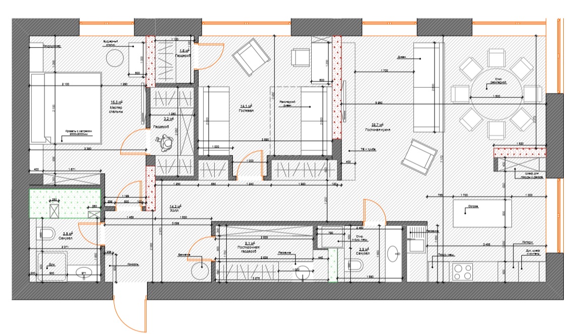 Здесь все электроточки привязываются к будущей мебели и технике, чтобы не оказалось, что розетка спрятана за шкафом или выключатель расположен в неудобном месте.