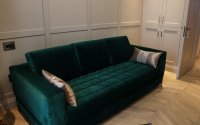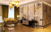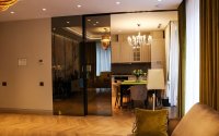 ✅ Гостиная, с витражным остеклением и текстильными обоями итальянского производства, создаёт атмосферу уюта и элегантности. В потолок вмонтированы динамики, предназначенные для домашнего кинотеатра