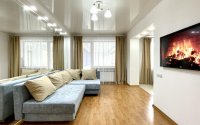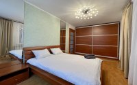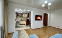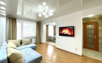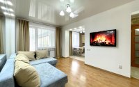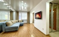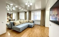2-комнатная квартира-студия бизнес-класса с двуспальной кроватью и дополнительным спальным местом - раскладным диваном в зале на 2 человека. Отлично подходит для командированных и спортсменов, сдается на любой срок.