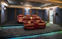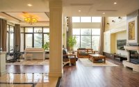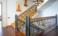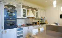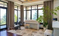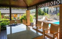На первом этаже - просторная прихожая, прачечная, сауна, гостиная из двух зон, каминный зал и столовая, кабинет, кухня, выход на внутреннюю часть двора с бассейном, кабинет.