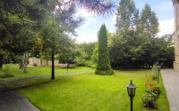 Дом большой, светлый, отделка из розового травертина. Озелененная территория.
