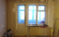 Входная дверь металлическая, пластиковые окна в зале и на кухне, балкон застеклен деревом, покрытие пола- линолеум.