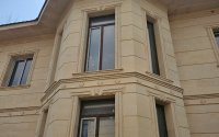 Фасад-травертин. Основа монолит, межкомнатные стены-кирпич. Окна- пластик.