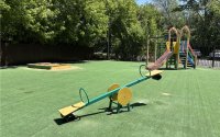 Тихий двор с детской площадкой огорожен забором со шлагбаумом.