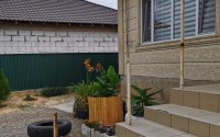Во дворе оборудован дополнительный санузел и помещение для хозяйственных нужд, обеспечивая функциональность без ущерба красоте двора.