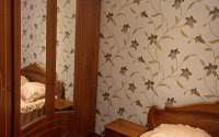 - Двуспальная кровать, тумбочки, большой шкаф, комод с зеркалом, подушки и одеяла.