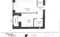 Находится на 9 этаже 9-этажного дома. Общая площадь — 42,37 м², кухня — 11,28 м², гостиная — 17,82 м², застекленная лоджия — 3,50 м². В квартире уже установлены межкомнатные перегородки, выполнена штукатурка в два слоя — стадия предчистовой отделки.