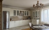 • Просторная кухня на первом этаже — светлая, с большими окнами, встроенным гарнитуром и всей необходимой техникой