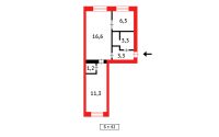 Расположена на 1 этаже кирпичного дома, общая площадь 43 кв.м, кухня 6,5 кв.м.