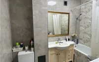 Уютный санузел с ванной, со стильной мебелью и отделкой под мрамор, балкона и лоджия