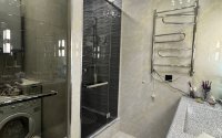 • Раздельный санузел с продуманной планировкой. Ванная комната разделена на две функциональные зоны: в одной — душевая кабина, а в другой стиральная машина и бойлер. Установлена каменная мойка, что добавляет долговечности и утончённости интерьеру. Такое разделение пространства позволяет удобно организовать быт и гарантирует комфорт.