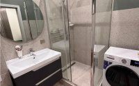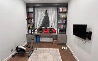 Ремонт выполнен из качественных материалов: кварц винил на полу, моющаяся краска Dulux на стенах, потолки 3 м. Установлена сантехника Grohe, кухня с зеркальными фасадами, встроенной техникой и посудомоечной машиной.
