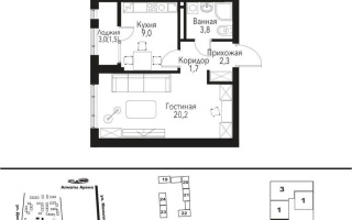 38.5 м², кухня – 9 м²