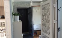Хранение вещей организовано с помощью шкафов в прихожей и большой зоны хранения в спальне.