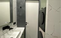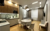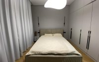 Мебель корпусная и мягкая, изготовлена на заказ. Двери 2,2 м, скрытого монтажа, натяжной потолок, теплые полы, скрытый в стену полотенцесушитель, фильтр для воды, кодовый замок с идентификацией хозяина по отпечатку пальца.