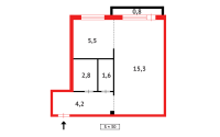 Общая площадь — 30 кв.м. В квартире выполнена удачная перепланировка: кухню (6 кв.м.) объединили с жилой комнатой, а из коридора сделали компактную гардеробную.