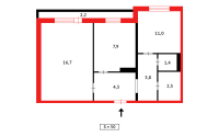 не угловая, комнаты изолированы. Общая площадь — 49,7 кв. м, кухня — 7,7 кв. м., лоджия --2,8 кв.м