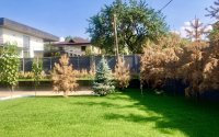 Ухоженный участок - газон, ели, ландшафтный дизайн. Летняя кухня с мангальной зоной, навес для автомобиля.