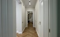 • По всей квартире уложен водостойкий ламинат класса премиум, уложенный «ёлочкой» – красиво и практично для семьи с детьми.