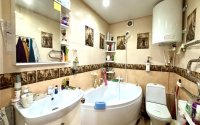 Совмещённый санузел с угловой ванной, установлен гарнитур, дорогой качественный кафель