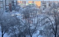 Благоустроенный двор с детской площадкой и освещенным футбольным полем.