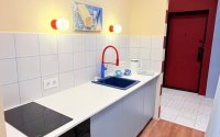 • кухня с выдвижной стеклянной дверью, через которую попадает солнечный свет. При этом мокрая зона не переносилась, это большой плюс.