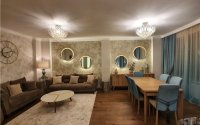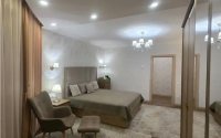 Площадь: гостиная 38 м², кухня 19 м², два санузла, две гардеробные, постирочная и балкон. Сантехника и двери высокого качества, установлена охранная сигнализация.