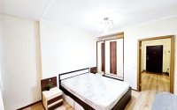 полностью меблирована: ламинат, деревянные двери, кухонный и спальный гарнитуры, диван, обеденный стол, шкаф-купе.