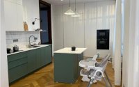 Много шкафов для хранения, мебель из МДФ. Пол из кварц-паркета, стены покрашены моющейся краской. Сантехника Grohe, кроме кухонного смесителя.