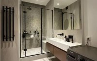 Есть полная шумоизоляция, дорогая качественная сантехника TECE, вся мебель из МДФ, теплый пол, магнитные треки, керамогранит: Италия, Испания.