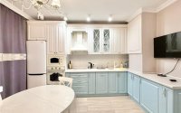 Стильная 2-комнатная квартира 65 м² с дизайнерским ремонтом, встроенной кухней, кладовкой и кондиционером, не угловая, окна во двор, тихий двор, полностью меблирована, рядом престижные школы, сады, супермаркеты и поликлиника в центре Юго-Востока — 6 этаж, дом 16.