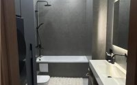 Пол ламинат 33 класса, столешница на кухне и раковина в ванной из камня.