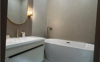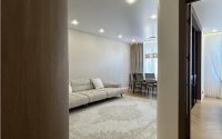 Качественный материал, испанский керамогранит, ламинат елочка, мебель мдф, двери шпон, качественная сантехника скрытого монтажа фирмы grohe и gappa.На кухне и в сан. узлах каменные столешницы. Мастер выключатель.