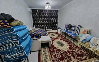 Мебель и техника: холодильник, стиральная машина, диван, кровать, обеденный стол с стульями, шкаф, ковры, люстры, плита, духовка, вытяжка.