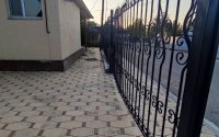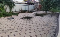 Покрытие во дворе - брусчатка и грунт.