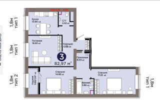 Кухня 12,12 м², гостиная 15,64 м², 2 спальни, 2 санузла, лоджия