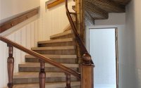 Перед входом – парковка для двух автомобилей. Участок – 12 соток, есть зона для барбекю, веранда, баня, на цокольном этаже бассейн, хозпомещение.