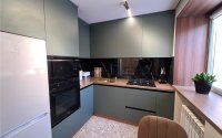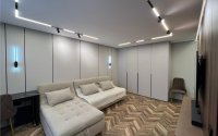 В квартире выполнен дизайнерский ремонт. Был произведен полный демонтаж до кирпича. Электропроводка медная с установкой автоматических выключателей на каждую группу потребителей и реле напряжения. Сантехническая разводка пластиковая. Лучевая система водопровода. Радиаторы отопления биметаллические. Пол на стяжке. в коридоре, сан узле и кухне напольное покрытие керамогранит, установлены теплые полы. В зале ламинат, укладка ёлочкой. Выполнена облицовка стен многослойным гипсокартоном для снижения уровня шума. TV зона оформлена с использованием декоративных панелей. Потолок из гипсокартона с трековым светом и парящим эффектом. Пластиковые 5-камерные окна. Кухонный гарнитур со встроенной техникой, вся мебель встроенная, в санузле душевая кабина, инсталляция и скрытая ниша для водонагревателя. Установлен кондиционер. Бронированная входная дверь.