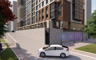 Двор освещенный с детской площадкой и удобными местами для парковки.