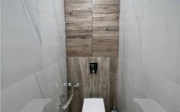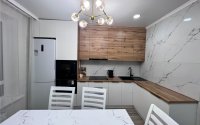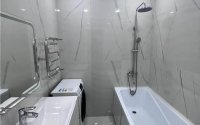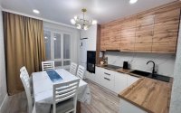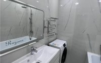 В квартире сделан качественный дизайнерский ремонт в светлых тонах. Стены выровнены под покраску, на полу постелен высококачественный ламинат, в ванной комнате и санузле на стенах керамогранит.