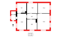 Четыре жилые комнаты (две спальни, зал, гостиная), кухня, и столовая совмещенный санузел, веранда.