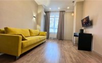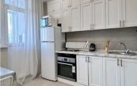 Стильная и уютная квартира с современным дизайнерским ремонтом. Просторная гостиная грамотно зонирована на две части: спальную зону (при необходимости можно изолировать шторами) и зону отдыха с диваном и ТВ.