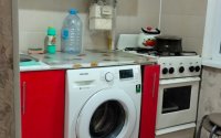 кухня-встроенный мебель,газовая плита ,стол,стуля.