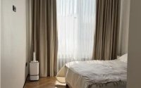 Мебель и шторы выполнены на заказ, диван премиум-класса. Установлены два кондиционера и электрический замок Philips. Во дворе тихо, безопасно, круглосуточная охрана и видеонаблюдение, всего 200 квартир в двух домах с четырьмя подъездами.