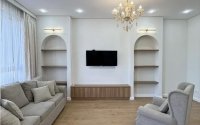 Планировка включает две спальни, просторную гостиную, кухню и два санузла. В гостиной и одной из спален установлены кондиционеры. Квартира частично меблирована: остаются кухонный гарнитур, встроенный гардероб, хозяйственный шкаф и прихожая. По договорённости возможно оставить гостевую мебель, а также раковины с тумбами в санузлах.