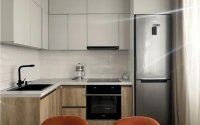 Качественные материалы: ламинат 33 класса, фасады МДФ, использовано качественное дерево, аккуратная отделка.