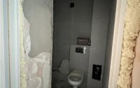 Санузел почти готов: кафель, установлены ванна и унитаз.