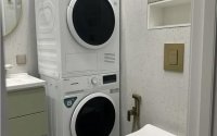 Остаётся вся техника: холодильник, газовая плита, духовой шкаф, вытяжка, стиральная и сушильная машины, микроволновая печь, посудомоечная машина.
