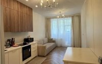 Установлены пластиковые окна, квартира не угловая, кухня объединена со студией. Сантехника полностью обновлена, двор спокойный и благоустроенный.