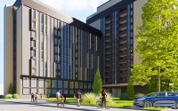 ЖК Auezov Apartments - два дома высотой от девяти до двенадцати этажей, спроектированные в едином стиле из экологически безопасных материалов по монолитно-каркасной технологии. Для облицовки фасадов использованы фиброцементные и алюминиевые панели, жидкий травертин и система из витражного стекла.